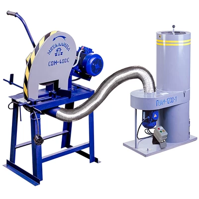 Защитные кожуха уменьшают разлетание искр во время работы отрезного станка СОМ-400С. Конструкция нижнего кожуха с патрубком позволяет подключить пылеулавливающий агрегат (ПУАМ) для фильтрации воздуха от абразивной пыли в рабочей зоне оператора.