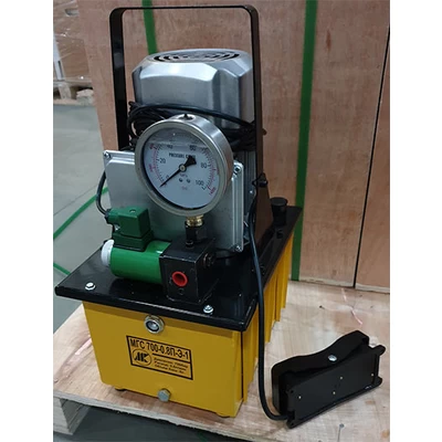 Маслостанция так же оснащена заполненным глицерином манометром со шкалой до 1000 бар. Однопоточная маслостанция МГС 700-0.8П-Э-1 с педалью используется в качестве привода для опрессовщиков кабелей, пресс-перфораторов, шиногибов, шинорезов, прессов, трубогибов гидравлических с электротприводом, домкратов гидравлических и силовых гидроцилиндров с пружинным возвратом штока. Маслостанция работает на гидравлическом масле "ВМГЗ".