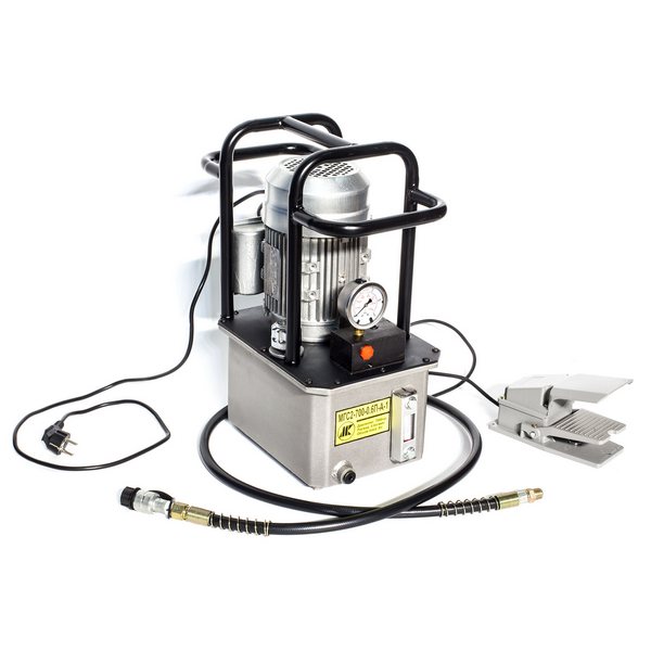 Переносная маслостанция МГС2 700-0.6П-А-1 с педалью используется в качестве привода для опрессовщиков кабелей, пресс-перфораторов, шиногибов, шинорезов, прессов, трубогибов, домкратов гидравлических, силовых гидроцилиндров и любого другого инструмента с пружинным возвратом штока, , не требующего удержания давления при остановке подачи масла.