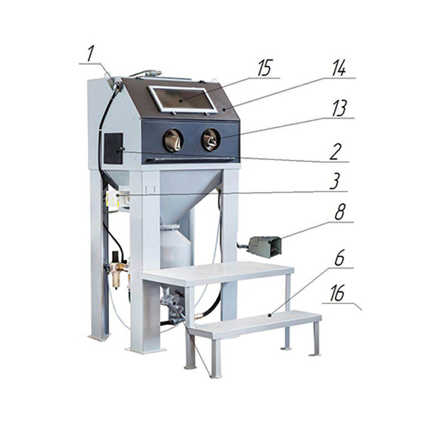 При включенной подаче воздуха и закрытых дверях абразивоструй-ной камеры процесс очистки может быть запущен нажатием педали. При нажатии на педаль абразивоструйный аппарат герметизируется и абрзивовоздушная смесь поступает по рукаву к соплу. После соударения с очищаемой поверхностью абразив, вместе с мелкими частицами с этой поверхности, пылью и другими побочными продуктами, образующимися при абразивоструйной обработке, падают через сито в бункер камеры. При отжатии педали абразивоструйный аппарат прекращает работу и разгерметизируется. Скопившийся в бункере абразив засыпается внутрь аппарата.