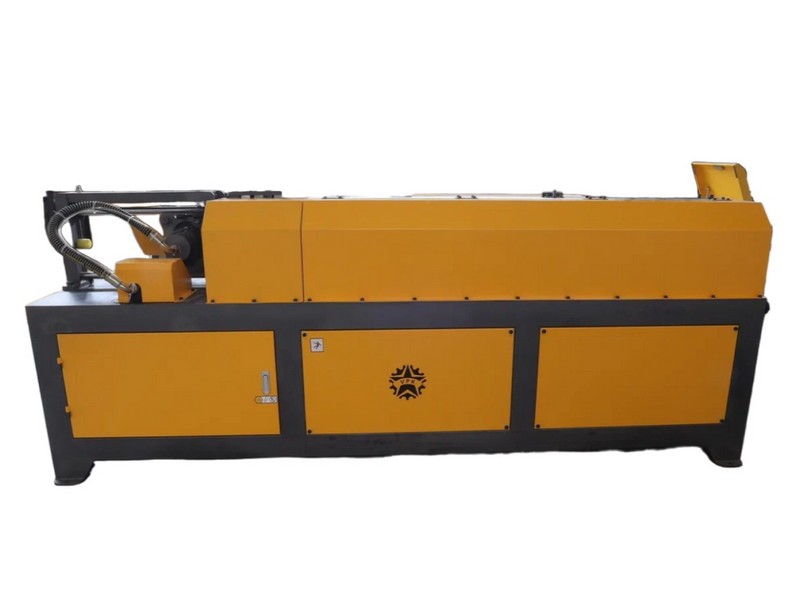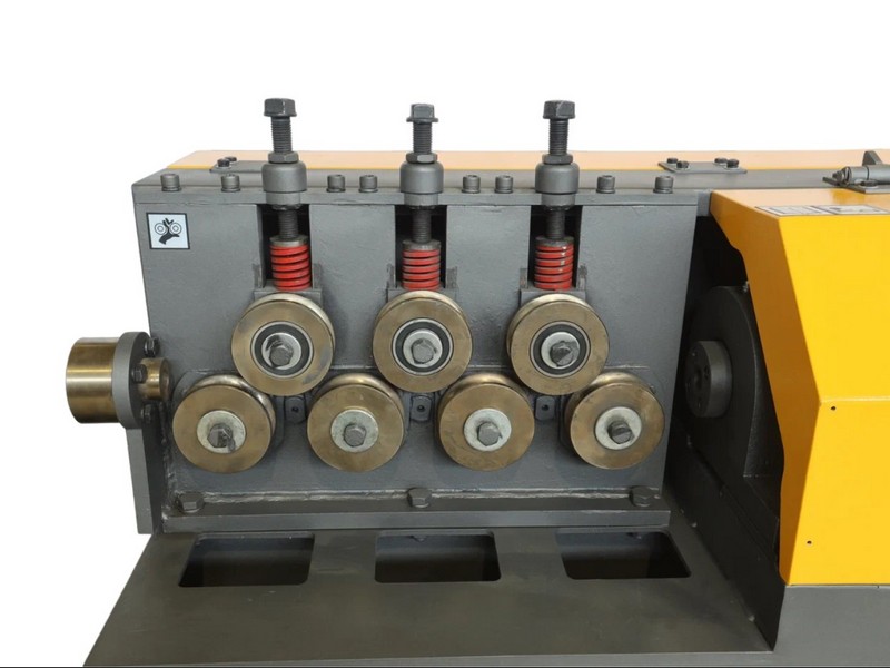 Арматура затягивается в станок роликами подачи. Проходя через выпрямительный механизм, она выпрямляется. Резку осуществляет нож при помощи гидропривода.