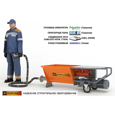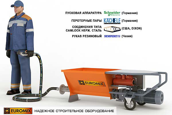 - Героторные растворные насосы серии EUROMIX 400.1 MINI комплектуются качественными узлами от известных мировых производителей: используются героторные пары фирмы Wilhelm Kaechele GmbH (Германия), мотор-редукторы пр-ва Италия.