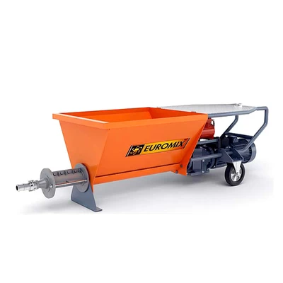 Ротор приводится в действие мотор-редуктором. Присоединение резинового шланга (растворопровода) осуществляется при помощи быстроразборного соединения типа СAMLOCK. Помимо героторного механизма, насосы EUROMIX 400.1 MINI комплектуются бункерами-накопителями для приема материала из смесительной установки. Насос монтируется на колесном шасси с дополнительными опорами.