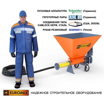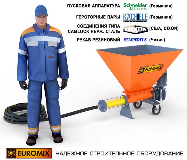 - Героторные растворные насосы серии EUROMIX 400.5.500 комплектуются качественными узлами от известных мировых производителей: используются героторные пары фирмы Wilhelm Kaechele GmbH (Германия), мотор-редукторы пр-ва Италия.