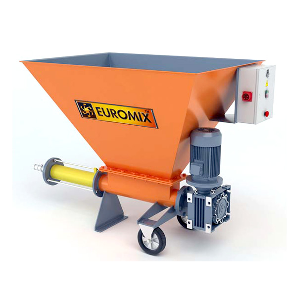 Ротор приводится в действие мотор-редуктором. Присоединение резинового шланга (растворопровода) осуществляется при помощи быстроразборного соединения типа СAMLOCK. Помимо героторного механизма, насосы серии EUROMIX 400.5.500 комплектуются бункерами-накопителями для приема материала из смесительной установки. Насос монтируется на колесном шасси с дополнительными опорами.