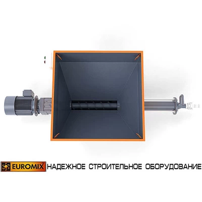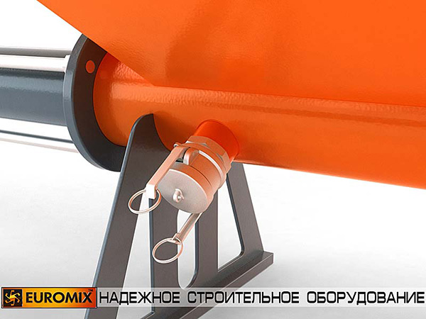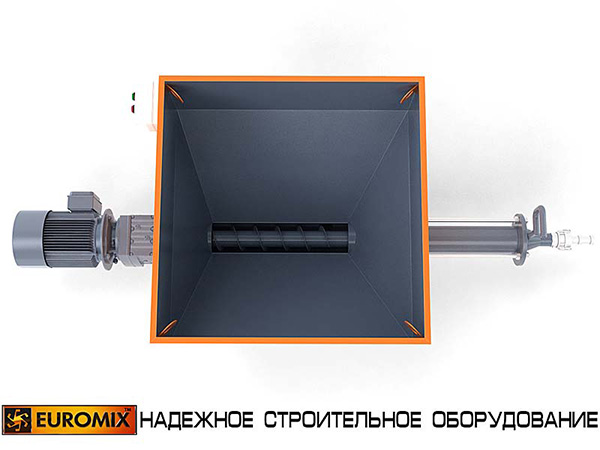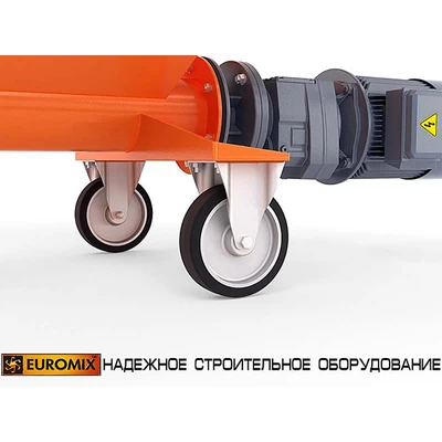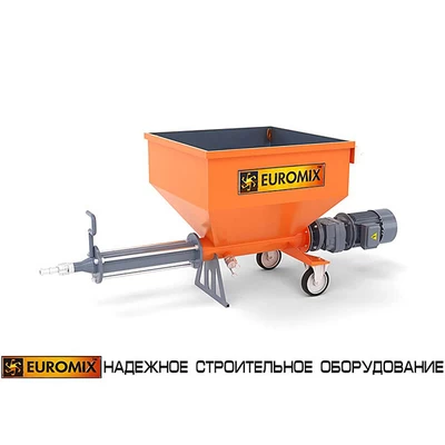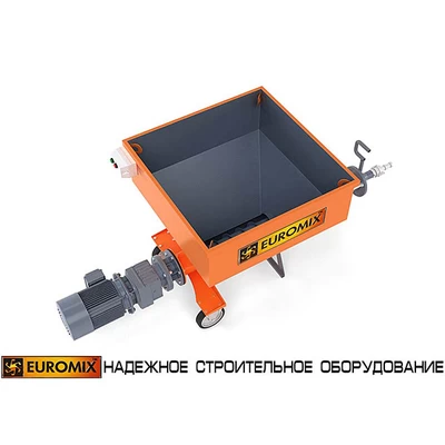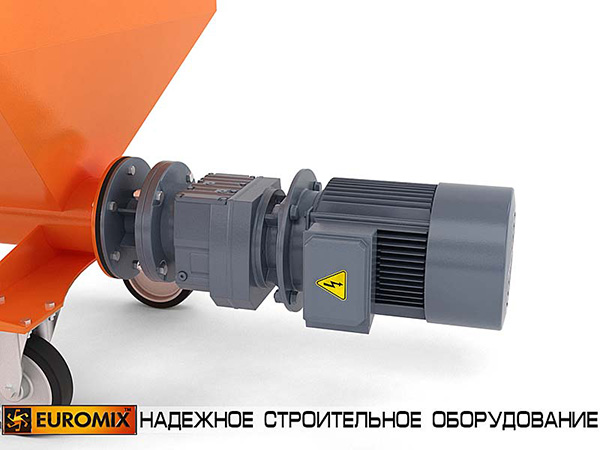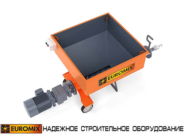Ротор приводится в действие мотор-редуктором. Присоединение резинового шланга (растворопровода) осуществляется при помощи быстроразборного соединения типа СAMLOCK. Помимо героторного механизма, насосы EUROMIX 400.8.300 комплектуются бункерами-накопителями для приема материала из смесительной установки. Насос монтируется на колесном шасси с дополнительными опорами.