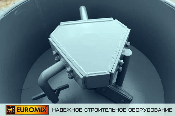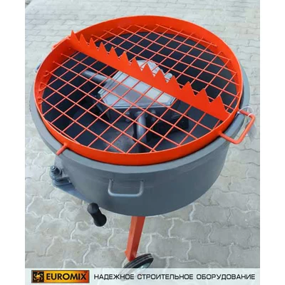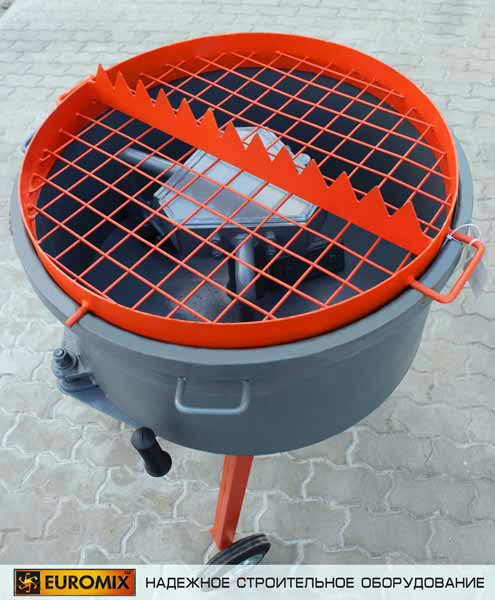 Загрузочное отверстие оборудовано решеткой для предотвращения попадания крупных фракций и ножом для вскрытия мешков. Растворосмеситель EUROMIX 600.120 MINI устанавливается на шасси с дополнительными опорами.
