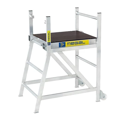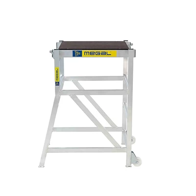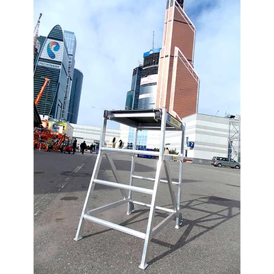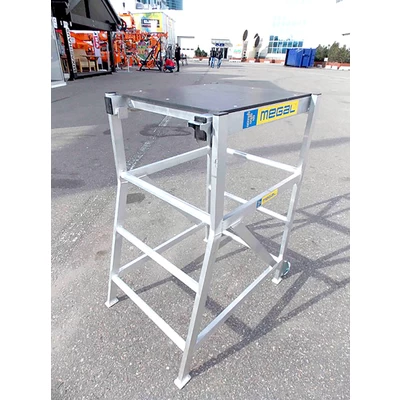 Компактный столик-лестница успешно используется для внутренних отделочных работ в помещениях. Удобная рабочая площадка позволяет наиболее комфортно разместиться человеку. Площадка регулируется по высоте, что позволяет использовать одно изделие при необходимости проведения работ на различных уровнях. Крепление площадки к раме осуществляется путем перевода замков в закрытое положение. Подъем осуществляется по рифленым ступеням, предотвращающим скольжение ноги, что позволяет использовать столики даже на открытых площадях в дождливую погоду. Для удобства перемещения столик оснащен колесами.