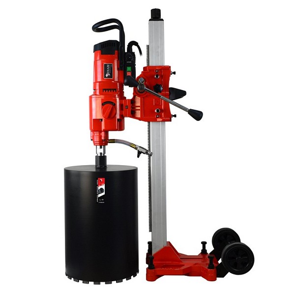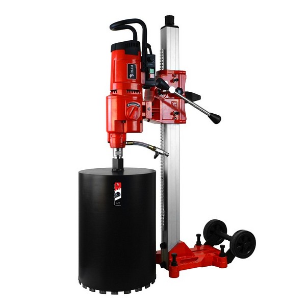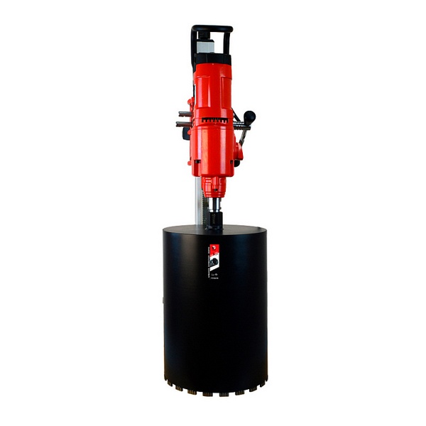 Сверлильная машина состоит из алюминиевой станины (стойки) с основанием и электродвигателя, закрепленного на рабочей каретке, которая перемещается по стойке с помощью стальной зубчатой рейки. Сверлильная машина имеет узел подвода воды с краном, электрическую защиту PRCD от удара электротоком. Также машина снабжена механической фрикционной муфтой, которая защищает электродвигатель от резкой нагрузки (заклинивания коронки в бетоне). Возможность плавной регулировки оборотов. Оснащены функцией DIGITAL CONTROL - цифровым дисплеем отображающим данные работы двигателя, такие как напряжение в сети, сила тока, потребляемая мощность в моменте, коэффициент мощности, частота тока, температура, счетчик потребляемого электричества, время работы. А так же специальные световые индикаторы нагрузки и перегрева двигателя.