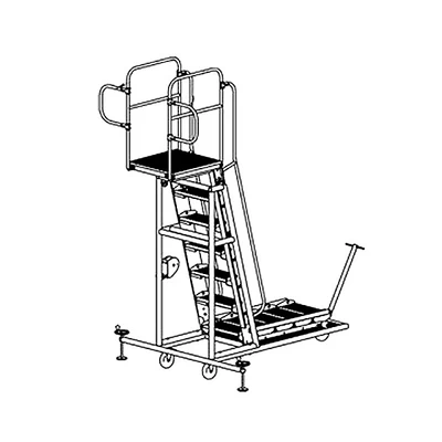 Трап с площадкой для обслуживания автоцистерн позволяет обслуживать автоцистерны разной высоты, регулировка высоты производится с помощью конструкции у основания лестницы, состоящую из ступеней и параллелограммного механизма, благодаря которому ступени всегда остаются в горизонтальном положении, подъем и опускание лестницы осуществляется с помощью барабанной лебедки с канатом. На верхней платформе предусмотрено ограждение, для безопасной работы на автоцистерне. Устойчивость лестницы в рабочем положении обеспечивают передние домкраты.