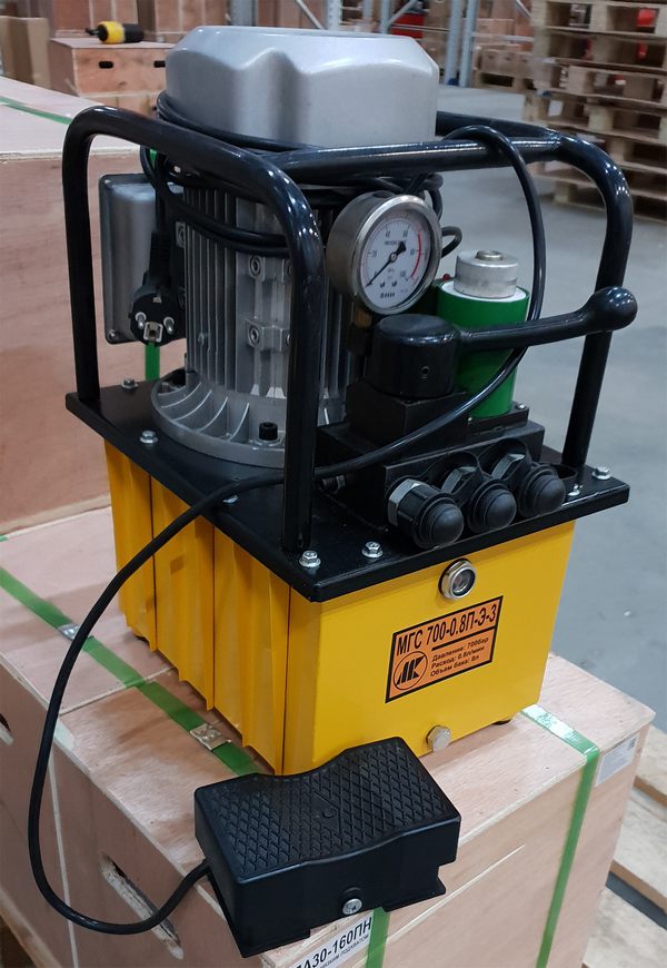 Трехпоточная маслостанция МГС 700-0.8П-Э-3 с педалью используется в качестве привода для опрессовщиков кабелей, шиногибов, шинорезов, пресс-перфораторов, прессов, трубогибов, домкратов и силовых гидроцилиндров с пружинным возвратом штока.