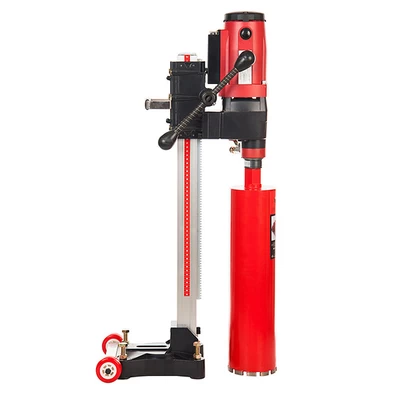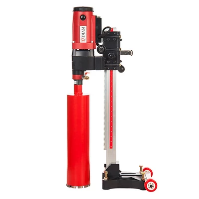 Станина установки алмазного бурения DIAM CSN-160 Normal может работать только под углом 90°. Установка используется для сверления отверстий в бетоне, железобетоне, кирпичной кладке и других строительных материалах. Широко применяется для сверления идеально ровных отверстий при электромонтажных работах, прокладке сантехнических и вентиляционных труб, взятия проб грунта. Вал двигателя имеет хвостовик с внутренней резьбой 1/2" и наружной резьбой 1 1/4". Подающий штурвал переставляется справа и слева.