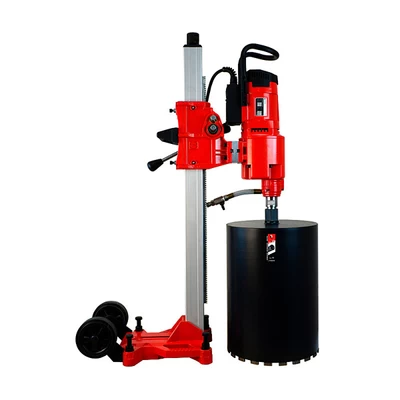 Максимальный диаметр сверления по железобетону составляет 300 мм, а по кирпичу 350 мм. Кнопка включения снабжена специальным силиконовым колпачком, который защищает от попадания влаги. Установка снабжена фрикционной муфтой, которая при резком повышении нагрузки или заклинивания коронки защищает редуктор и электродвигатель от поломки.