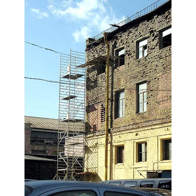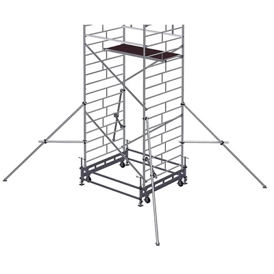 Вышка собирается из двухметровых и метровых вертикальных рам. Рамы стыкуются между собой и фиксируются крепежными скобами. Все ступени рам выполнены из рифленого профиля. Используются диагональные и горизонтальные связи (стяжки). Рабочий настил размером 2000 х 1000 мм с люком. Количество промежуточных площадок от 4 до 8, в зависимости от модели. Полный комплект консолей-стабилизаторов, 4 шт.. Монтируются на усиленном широком основании. Монтируется на усиленном основании из двойной траверсы с колесами. Опорная поверхность на домкратах, исключая колеса.