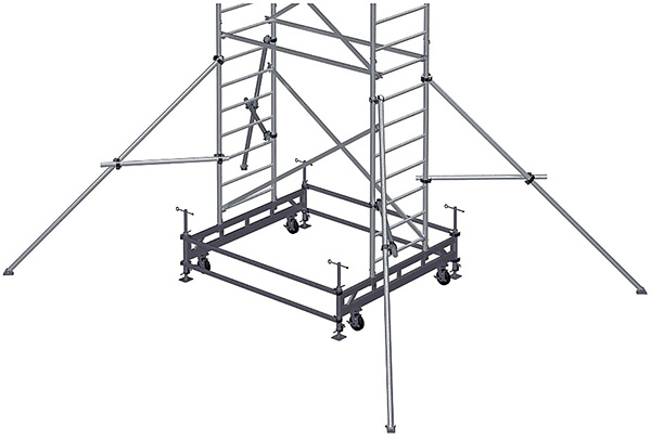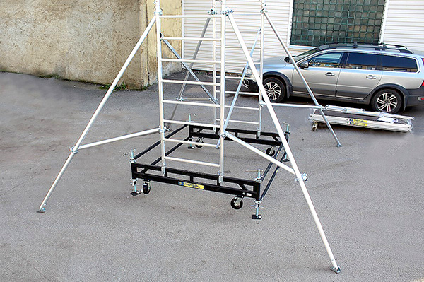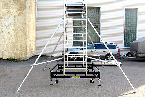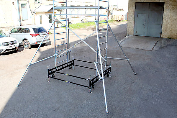 Вышка собирается из двухметровых и метровых вертикальных рам. Рамы стыкуются между собой и фиксируются крепежными скобами. Все ступени рам выполнены из рифленого профиля. Используются диагональные и горизонтальные связи (стяжки). Рабочая площадка размером 2000 х 700 мм с люком. Количество рабочих площадок от 4 до 8, в зависимости от модели. Полный комплект консолей-стабилизаторов, 4 шт. Монтируется на усиленном основании из двойной траверсы с колесами. Колеса поворотные со стопорами. Опорная поверхность на домкратах, исключая колеса.